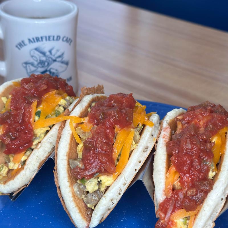 3 tacos served in pancakes filled with scrambled eggs, cheese, bacon, and home fries | add real maple syrup $3.75